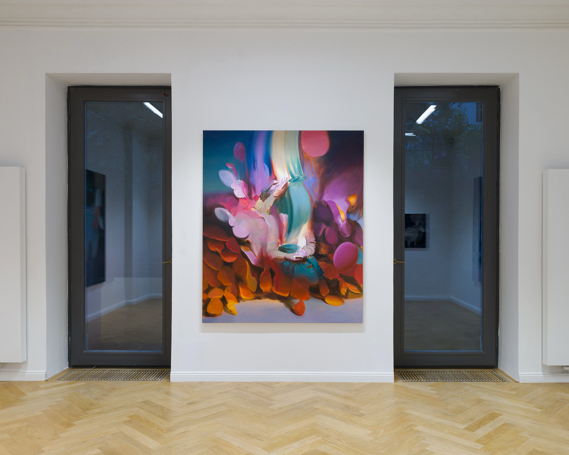 In his artistic practice, Tomáš Tichý mostly presents himself as a figurative painter, reflecting on the position of man and the nature of humanity in the conditions of the current world, as its boundaries with the virtual environment become increasingly blurred. Lately, however, classical figuration has practically disappeared from Tichý’s paintings, as if in an era of easily manipulated reality, overflowing with images of idealised faces, we were losing the notion of what it actually means to be human today. And although humankind remains the basis for the author’s thinking, in his current work, flat, abstract structures seem to have taken over, sometimes revealing only a vague fragment of the human body, like a flash of a distant memory. The paintings are dominated by strange objects, “digital plants”, which the author sees as a visual metaphor for artificial intelligence. The forms of the objects, evoking both the biological process of organic growth and the process of data replication in a virtual environment, have gradually transformed into something like universal painting models, bearing meaning on many different levels – from the principles of human thought and perception, through data flows in the digital sphere, all the way to the cosmological or astrophysical levels.