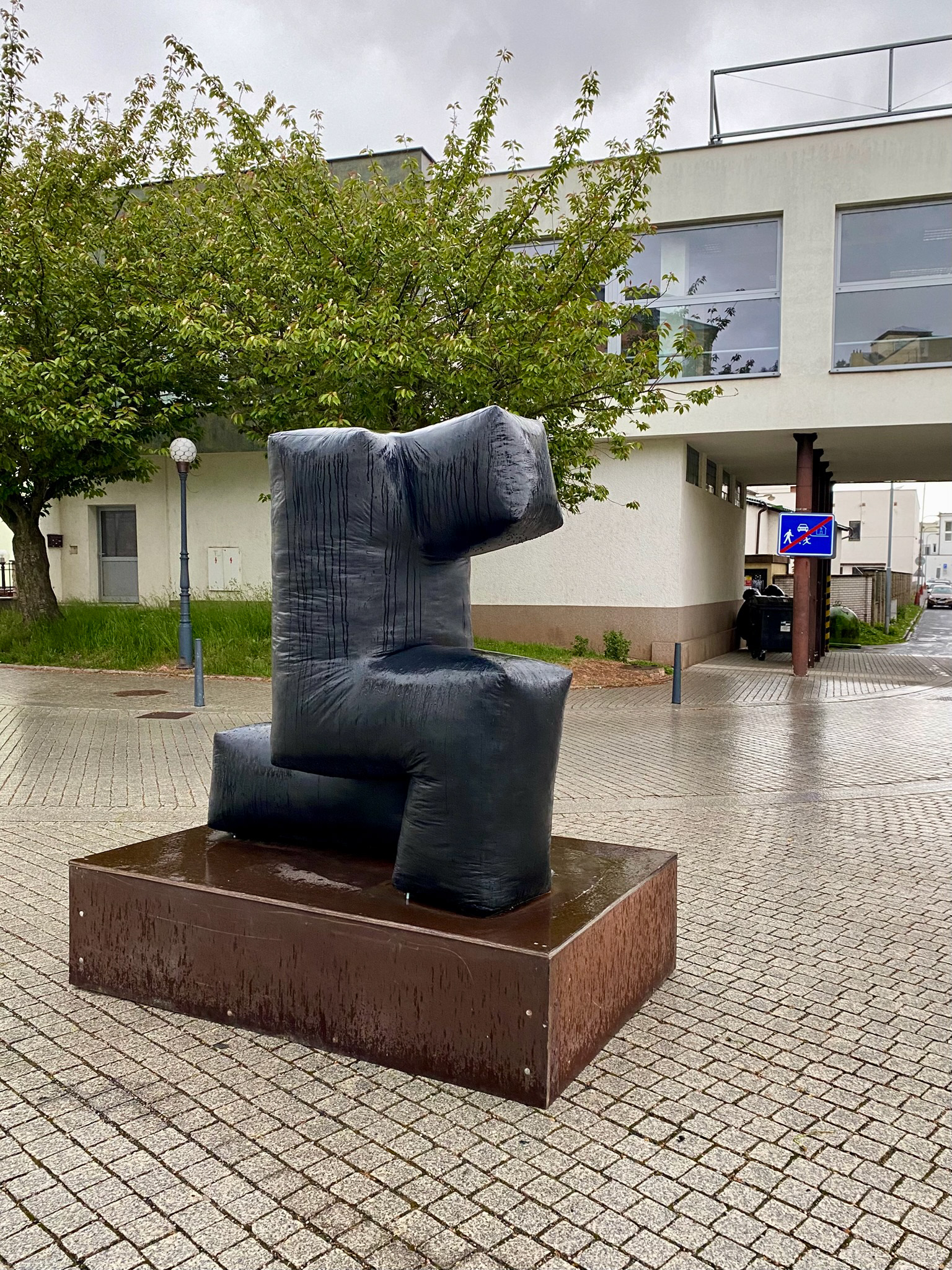 Vystoupení současného umění z bezpečí galerie do městského prostředí je vždy citlivou záležitostí, v případě textilních soch Martina Skalického (* 1976) je však tento krok zcela přirozený. Tvarosloví historických soch, s nímž Skalický pracuje, nenápadně vplouvá do místního kontextu, jako by od nepaměti bylo jeho součástí. Při bližším pohledu ale zjistíme, že tady něco nehraje. Sousoší ženských figur nepředstavuje nekonfliktní téma Tří Grácií, ale jednu a tutéž alegorickou postavu, utvářenou odlišnou ornamentální strukturou, a ani barokní erb jako tradiční znak donátora by na fasádě budovy bývalého Okresního výboru KSČ nebyl myslitelný. Díky využívání obecně srozumitelných symbolů, na nichž byla po staletí budována západní kultura, však mohou Skalického sochy do prostředí historicky utvářeného města nenásilně vnášet další významové roviny, vztahující se k aktuálním problémům společnosti i světa umění.