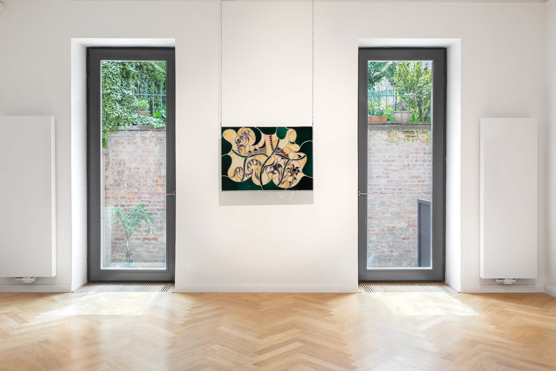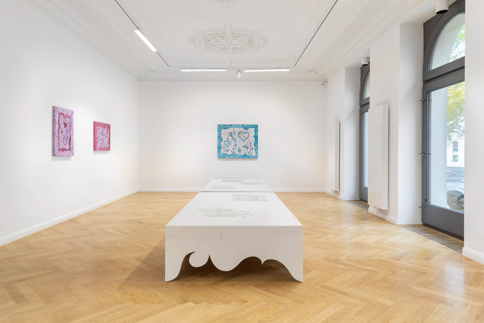 Anežka Hošková primarily considers herself a drawer, but she also paints and often also creates objects as well as performative installations in which she becomes part of the scenic work of art. In recent years, she has become increasingly interested in traditional arts and crafts techniques and, in addition to stained glass, she has also started experimenting with three-dimensional glass objects that further develop her distinctive expression, which is primarily based on drawing.